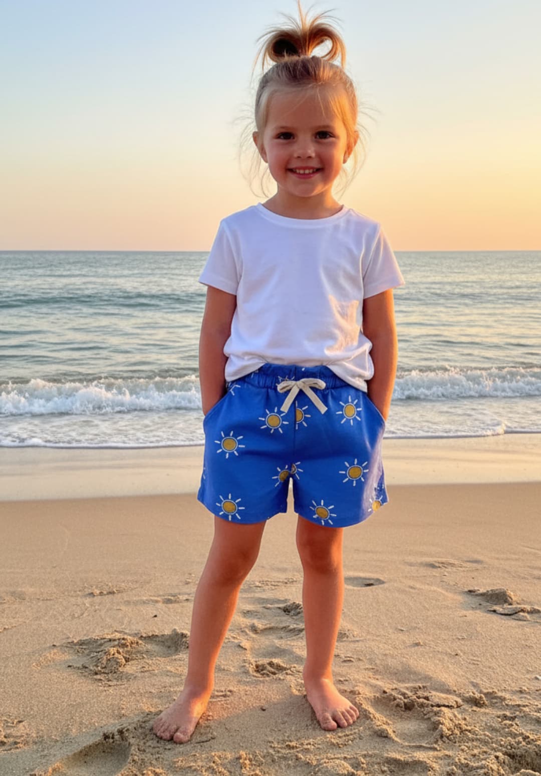 Short infantil de cintura elástica con cordón, confeccionado en tela ligera y fresca. Diseño azul vibrante con estampado de soles amarillos, perfecto para días de playa o juegos al aire libre. Suave, cómodo y de secado rápido